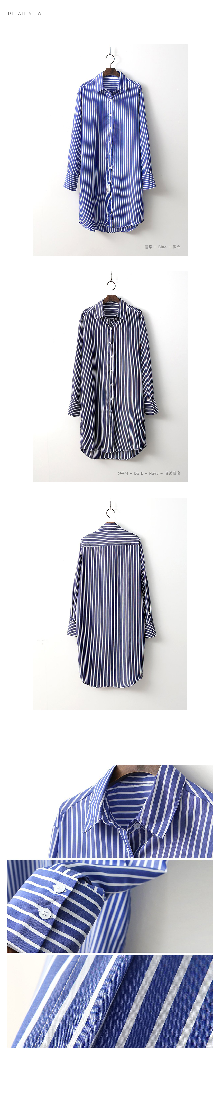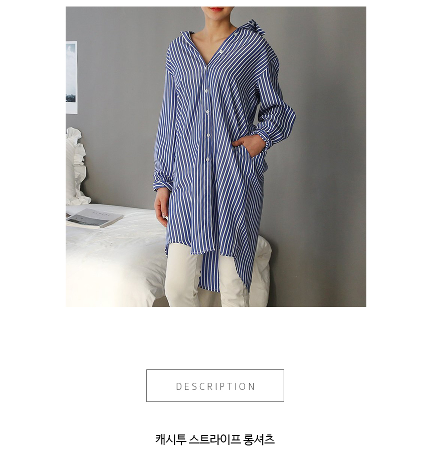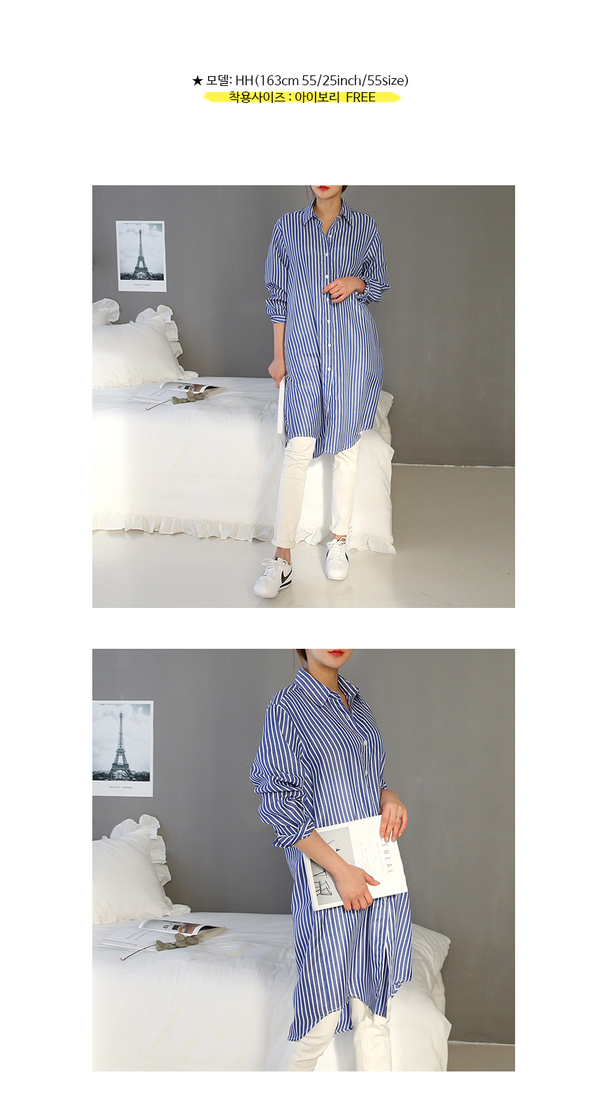 스트라이프 패턴의 롱 셔츠예요 단품으로 입어도 너무나도 멋스러운 아이템이지만 가디건 또는 베스트와 함께 코디해 주셔도 모던한 무드를 자아 내주는 스타일을 완성해줘요 군더더기 없이 깔끔한 핏감과 롱한 길이감으로 편안하게 즐길 수 있어 추천해 드려요 유행 없는 스트라이프 패턴으로 센스 있게 즐겨보아요 색상은 블루, 다크네이비 사이즈는 FREE55~77