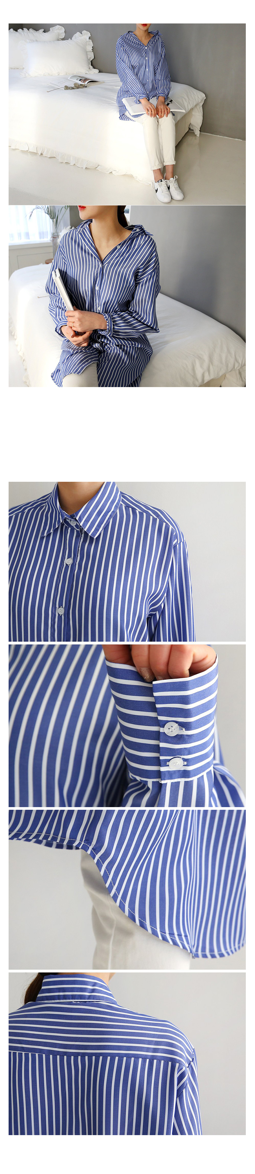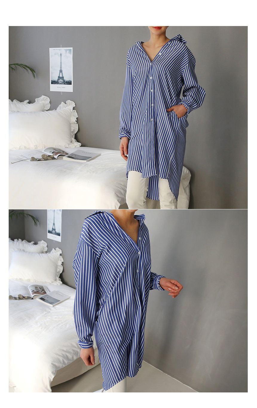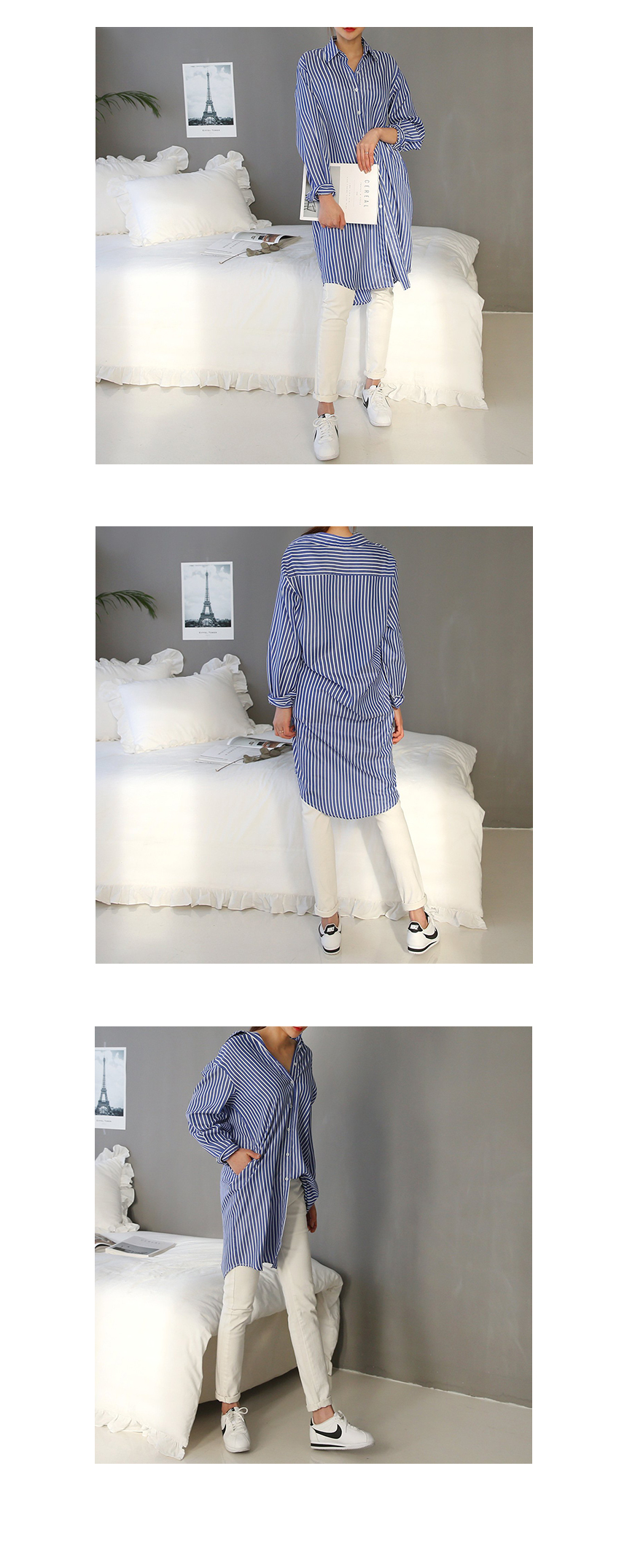 스트라이프 패턴의 롱 셔츠예요 단품으로 입어도 너무나도 멋스러운 아이템이지만 가디건 또는 베스트와 함께 코디해 주셔도 모던한 무드를 자아 내주는 스타일을 완성해줘요 군더더기 없이 깔끔한 핏감과 롱한 길이감으로 편안하게 즐길 수 있어 추천해 드려요 유행 없는 스트라이프 패턴으로 센스 있게 즐겨보아요 색상은 블루, 다크네이비 사이즈는 FREE55~77