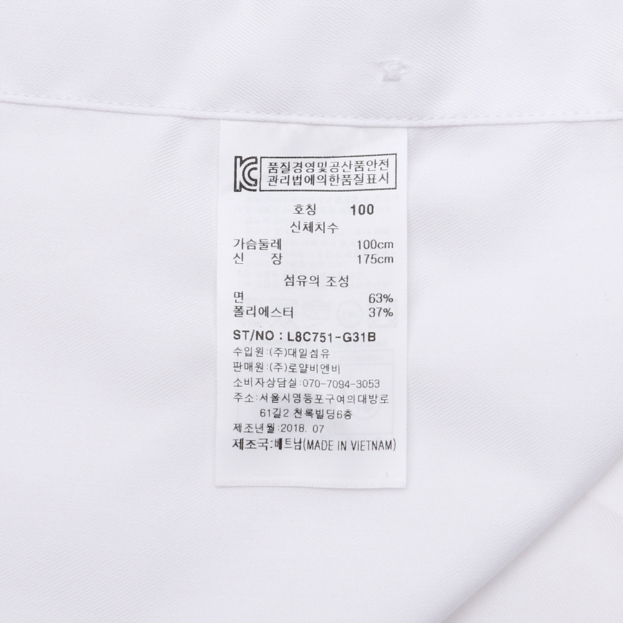 품번:L8C751-화이트 혼용률:면63%폴리37% 제조국:베트남