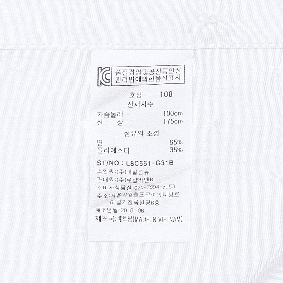 품번:L8C561-화이트 혼용률:면65%폴리35% 제조국:베트남