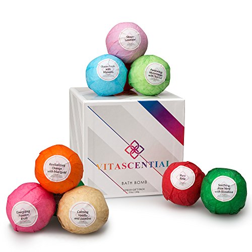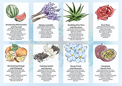 - CREATE YOUR PERSONAL OASIS - Eight luxury bath bombs in eight luscious colors - made from relaxing fragrances and real flower petals. Each of these bath fizzers offers a different aromatherapy experience - Revitalizing Orange, Awakening Watermelon, Calming Vanilla, Soothing Aloe Vera, Ocean Fresh, Pure Rose, Energising Passion Fruit and Sleepy Lavender. Each one is carefully chosen to help you unwind after a busy day. Treat yourself - because you deserve to feel the gift of deep relaxation.