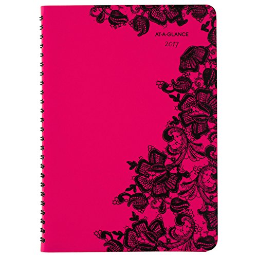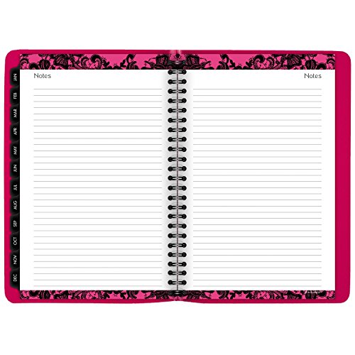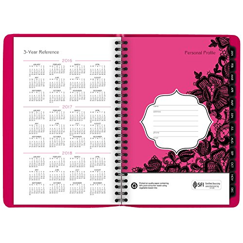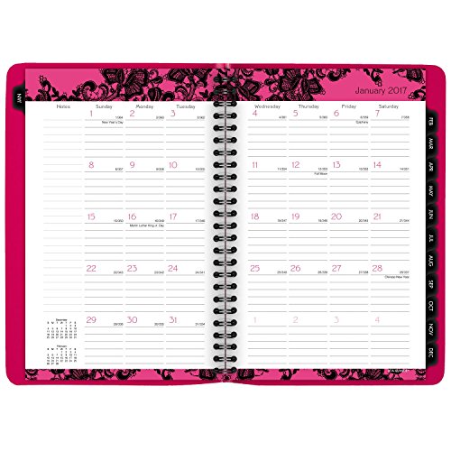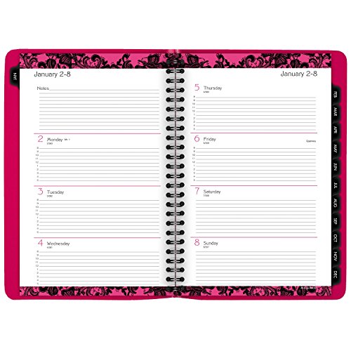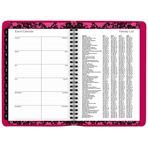 -. Feature : Plan for a well-organized year with this bright pink and black floral lace weekly and monthly planner; improved paper resists ink bleed*; 13 months of planning, January-January; 5.5 x 8.5 inch page size; 6.25 x 8.78 x .25 inches overall; Made in the U.S.A. / Weekly: one week per two-page spread with hourly appointments, 8 a.m.-5 p.m.; Monthly: one month per two-page spread; notes space; past and future months reference; monthly tabs for quick reference and navigation; days and days remaining / Special pages include a 3-year reference, holiday list, event calendar, notes pages and contacts; simulated leather cover; P.R.Inted on quality paper with 30% post-consumer waste using vegetable based inks
