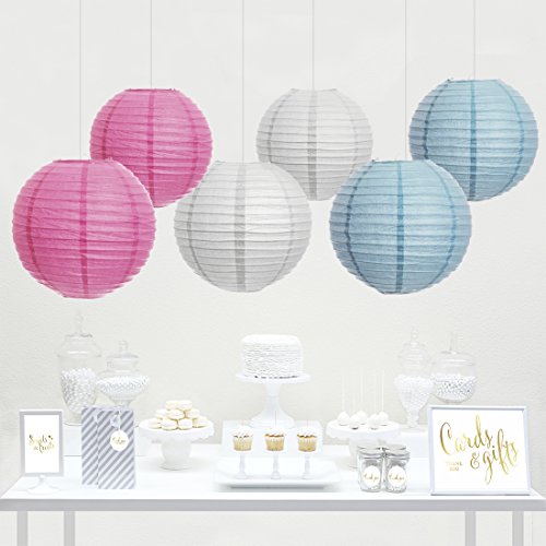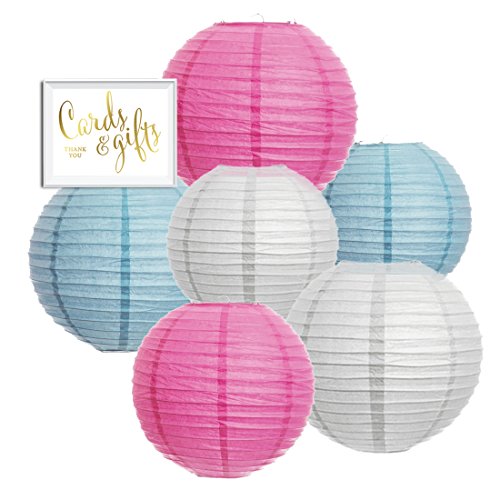 Andaz Press Hanging Paper Lantern Party Decor Trio Kit with Free Party Sign, Pink, Baby Blue, White, 6-Pack, For Gender Neutral Reveal Baby Shower...