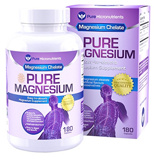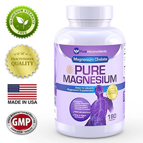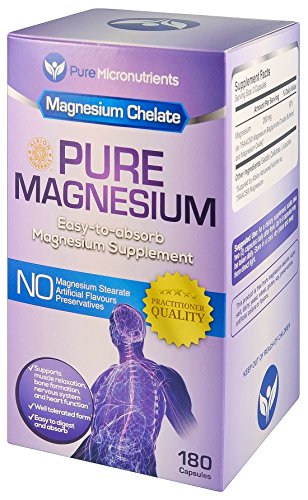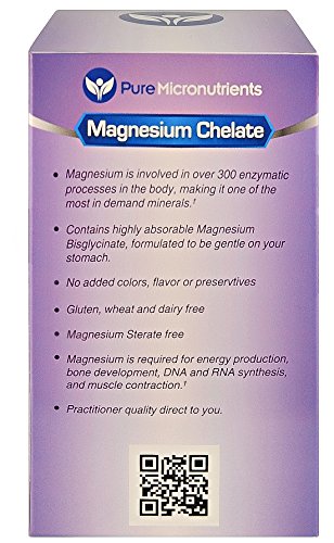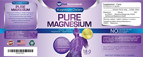 -. Binding : Health and Beauty -. Brand : Pure Micronutrients -. Color : Purple, Blue, White -. EAN : 0784672302180 -. Feature : Practitioner Quality Premium Chelated Magnesium supplement in an easy to swallow capsule that is gentle on the stomach. / Magnesium chelate (Magnesium Glycinate) is clinically proven to be a highly absorbable and tolerable form of Magnesium.† / NO Magnesium Stearate, Dye, Preservatives or artificial colors, gluten, yeast, starch or dairy and is NON-GMO / Perfect magnesium supplement for women, men, elderly, pregnant women, & teenagers. / Essential for energy production, nervous system function, bone formation, blood sugar metabolism, cardiovascular function, and muscle relaxation. Ideal if you suffer from Stress & Anxiety, muscle spasms and cramps, Heart Arrhythmia, Migraine headaches, Chronic fatigue, PMS, Morning Sickness, Thyroid problems, Hyperglycemia, Hypertension, Vertigo and Sleep disorders.† Customer Promise - 60 day MONEY BACK GUARANTEE! -. IsAdultProduct : 0 -. Label : Pure Micronutrients -. LegalDisclaimer : While we work to ensure that product information is correct, actual product packaging and materials may contain more and/or different information than that shown on our Web site. We recommend that you do not solely rely on the information presented and that you always read labels, warnings, and directions before using or consuming a product. For additional information about a product, please contact the manufacturer. Content on this site is for reference purposes and is not intended to substitute for advice given by a physician, pharmacist, or other licensed health-care professional. You should not use this information as self-diagnosis or for treating a health problem or disease. Contact your health-care provider immediately if you suspect that you have a medical problem. †Information and statements regarding dietary supplements have not been evaluated by the Food and Drug Administration and are not intended to diagnose, treat, cure, or prevent any disease or health condition. -. Manufacturer : Pure Micronutrients -. PackageQuantity : 1 -. ProductGroup : Health and Beauty -. ProductTypeName : HEALTH_PERSONAL_CARE -. Publisher : Pure Micronutrients -. Studio : Pure Micronutrients -. Title : Pure Magnesium - Premium Gentle Magnesium Glycinate (Albion Chelated Magnesium), 200mg, 180 Count -. UPC : 784672302180