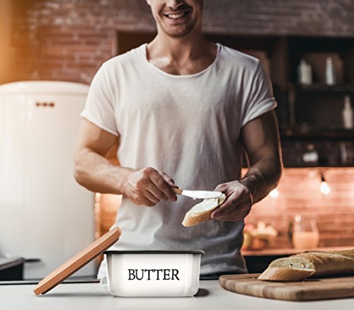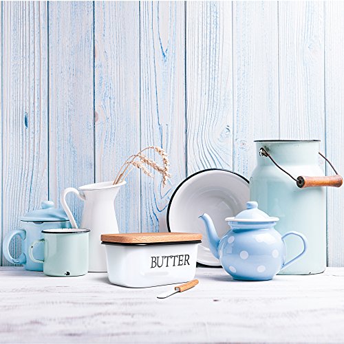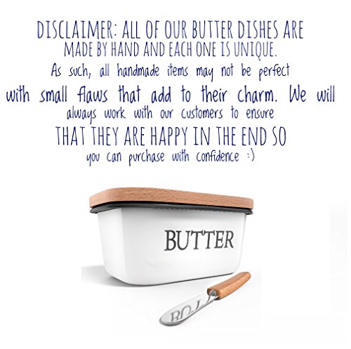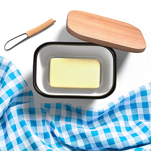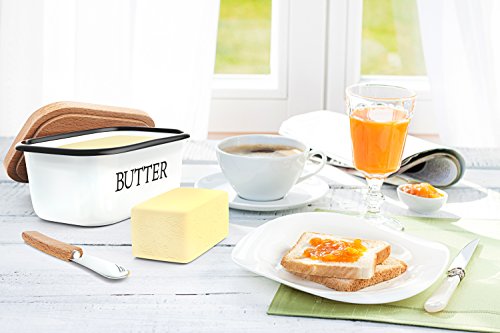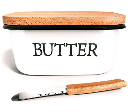 Studio : Kuchenchef Publisher : Kuchenchef Product Description Country style butter dish made out of carbon steel and enamel making it absolutely unbreakable Comes with a matching butter knife with wooden handle. Beechwood lid and butter knife handle are imported from New Zealand Upside down design prevents butter from melting all over your counter on hot days! Exquisite Vintage look will give your kitchen a cozy, country feel. Our butter dish can hold 2 sticks of Standard/Eastern butter or 1 stick of Western/European butter. Suitable for most brands' butter: Kerrygold, Land O'Lakes, Plugra,etc. CARING INSTRUCTIONS: Hand Wash Only. Avoid running through the dishwasher. Please wipe it with a cloth after washing and air dry in a cool place. Avoid exposure in the sun. Wooden lid should not be exposed to water for extended periods of time as it may cause warping. Wooden lid can be conditioned with vegetable oil for extra protection. 0