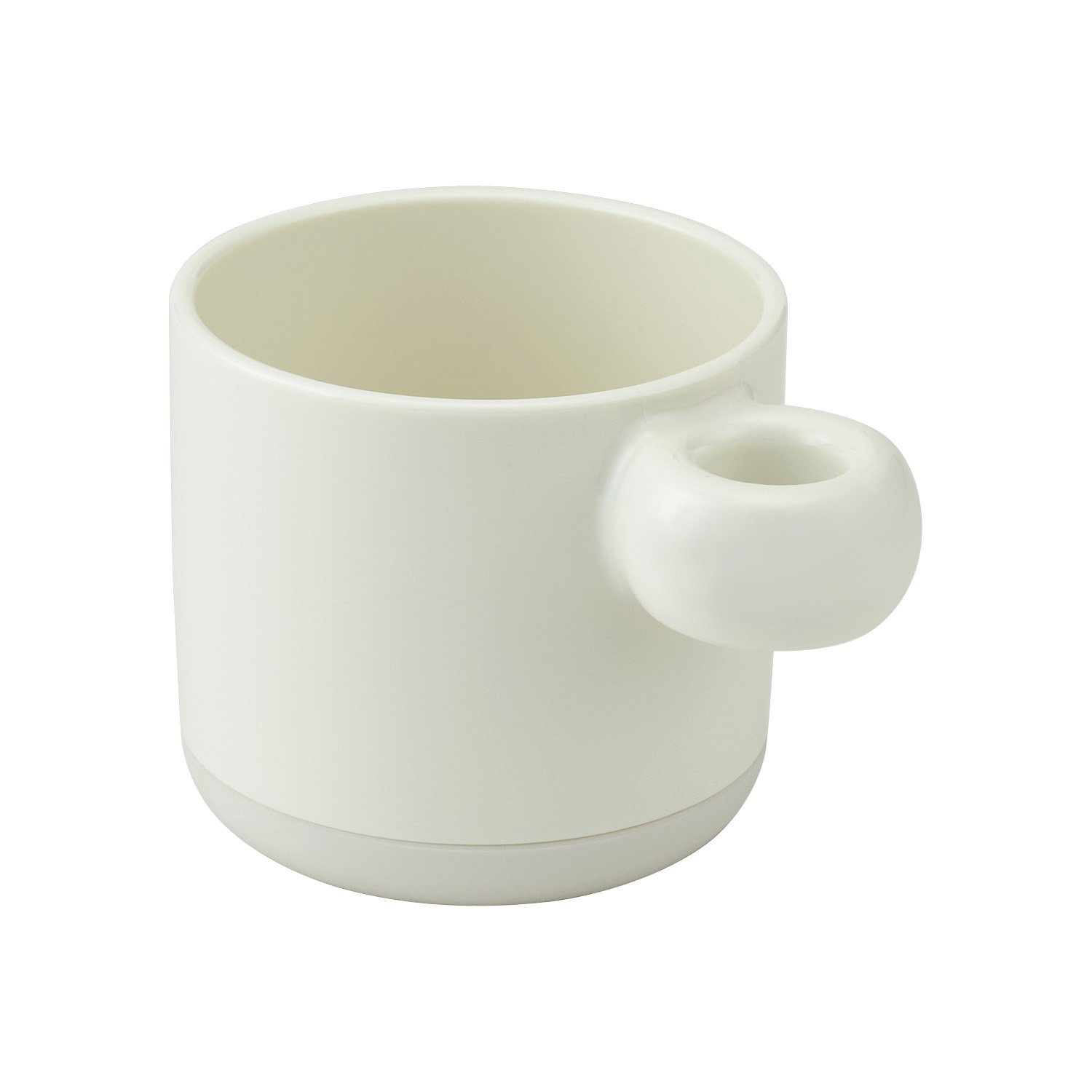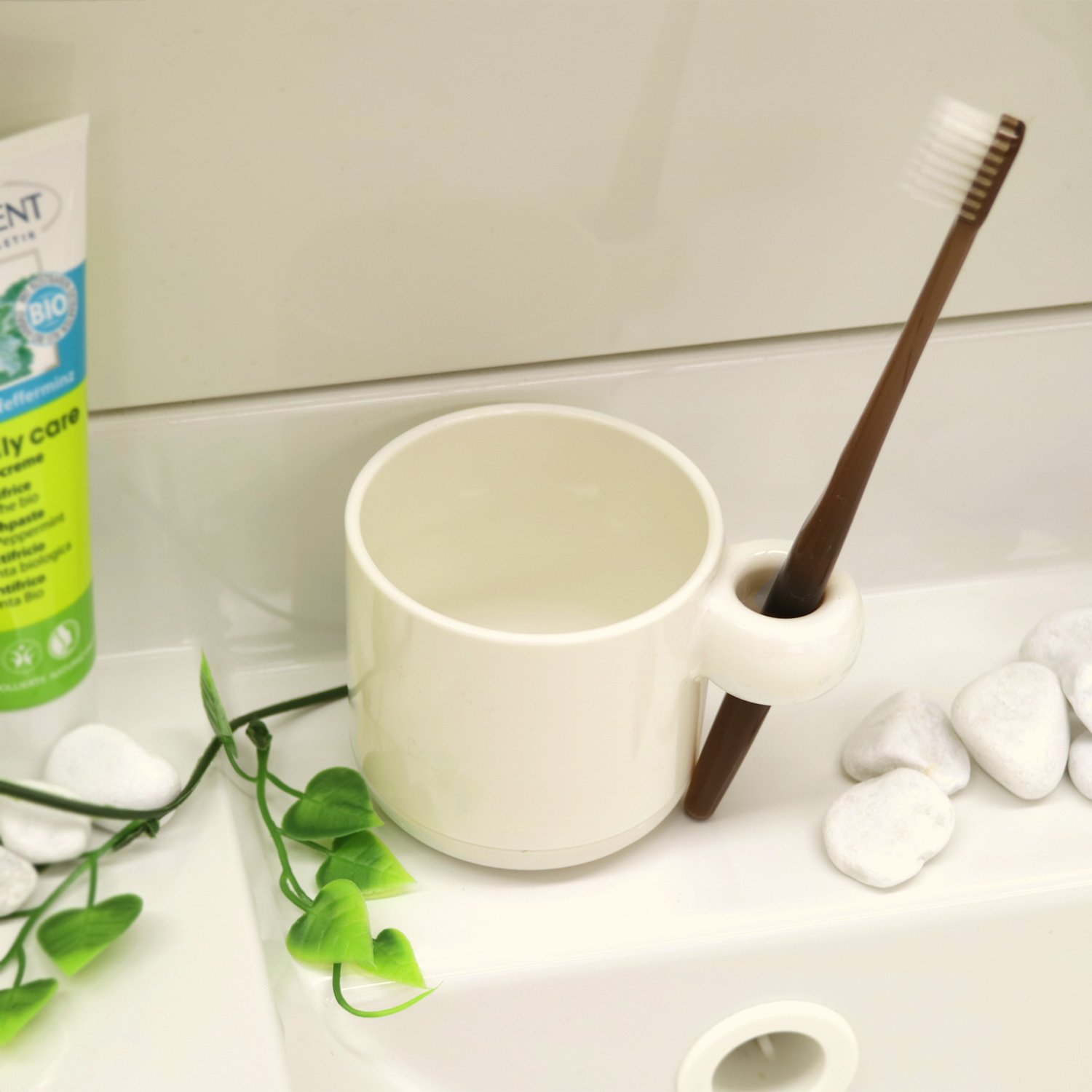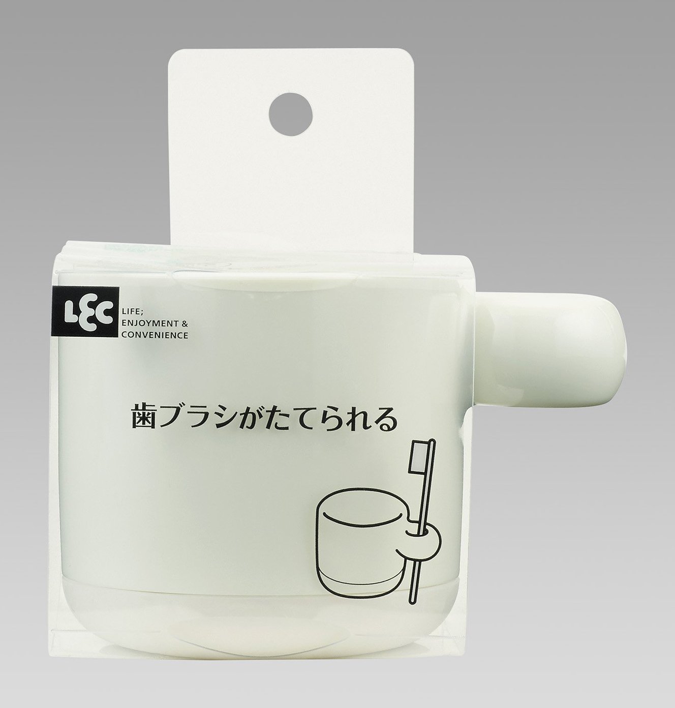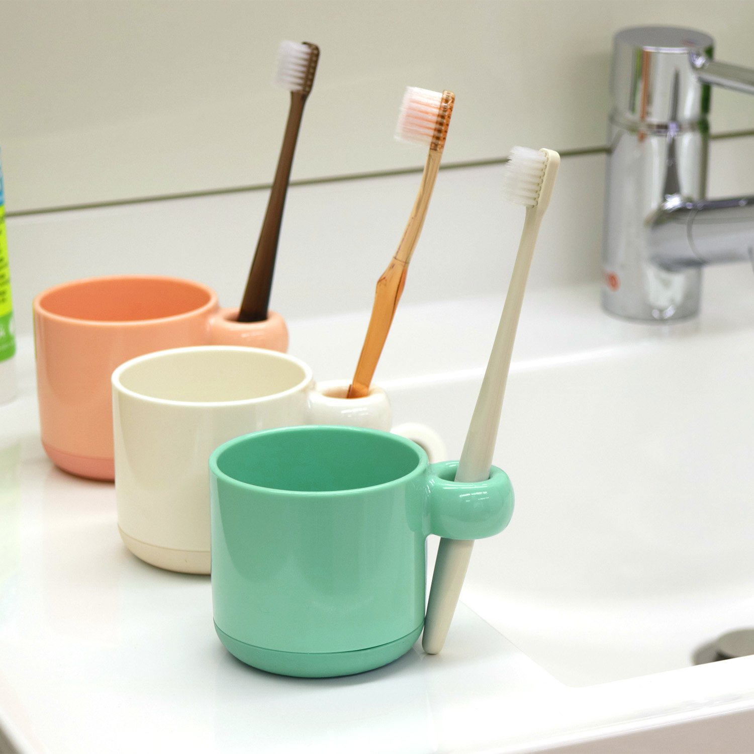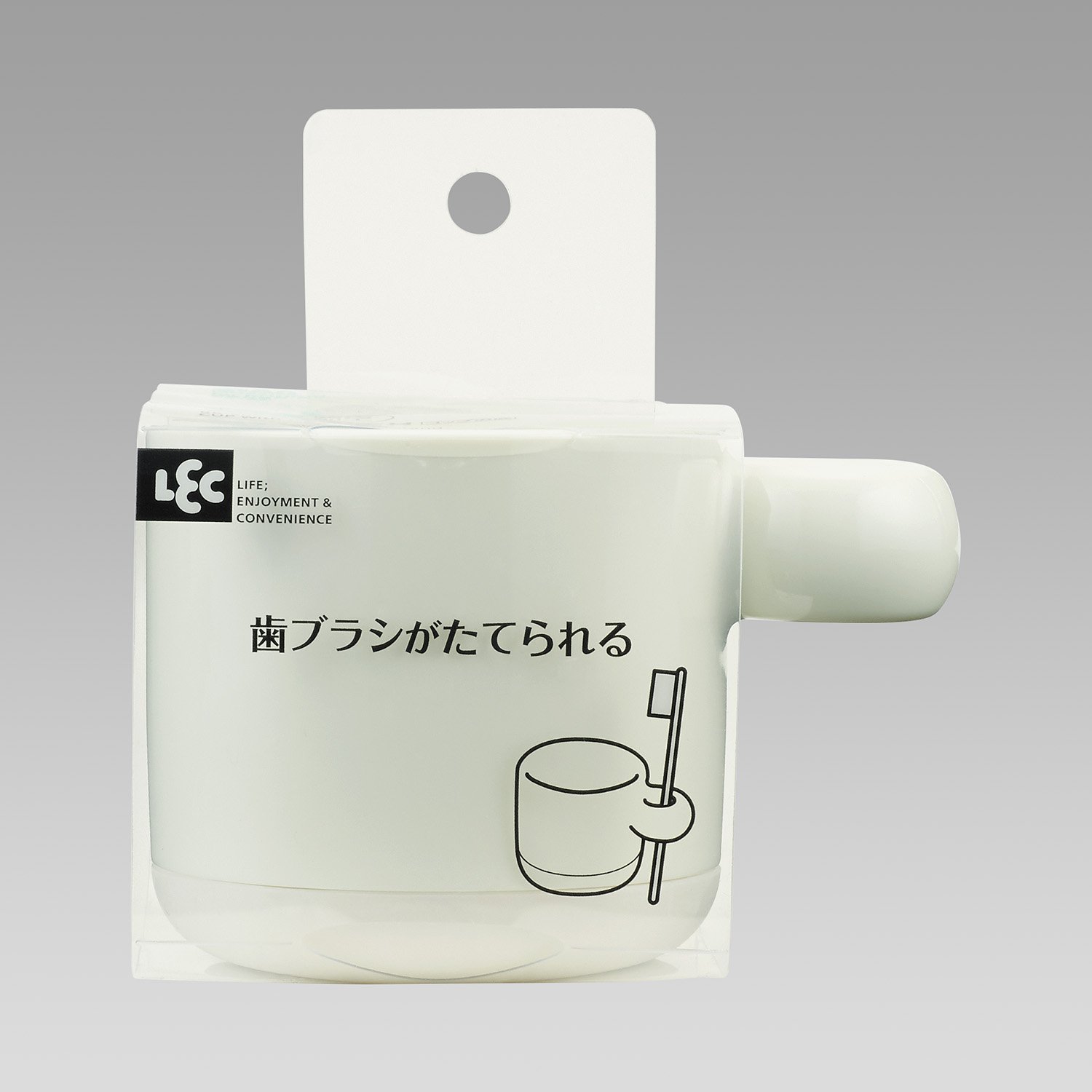 It is an idea cup in which a toothbrush can be set on the handle part.