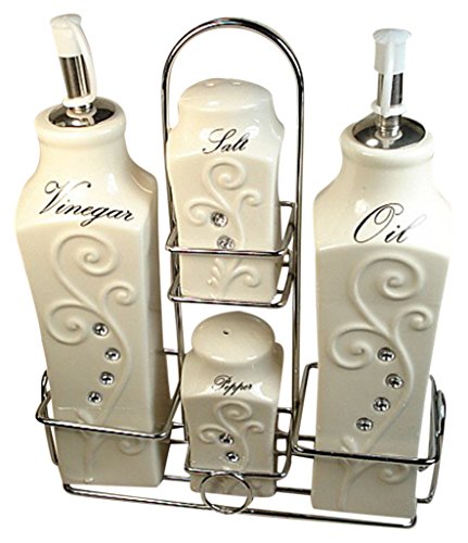 - Information: - 5 piece oil vinegar Salt pepper cruet set.- Made of durable porcelain, each set comes packaged in a satin lined display window box.- metal stand for display and storage included