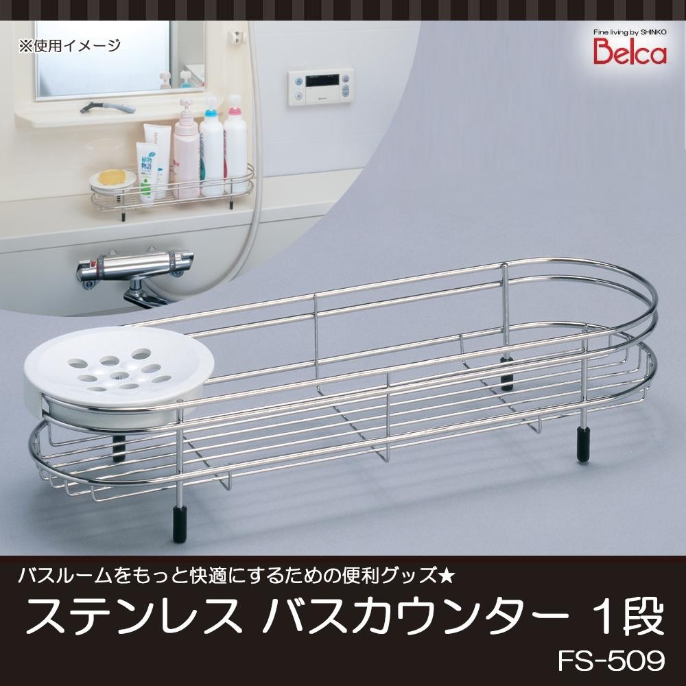シャンプーなどのボトル類や石鹸をすっきり収納☆バスルームをもっと使いやすく!! 製造国:中国 素材・材質:本体:ステンレス石けん皿:PPキャップ:PE 商品サイズ:約408×124×80mm 仕様:耐荷重:5kg ※サプライヤー直送品 ご注文後2~3営業日後の出荷となります【商品名】Belca(ベルカ) ステンレス バスカウンター 1段 FS-509