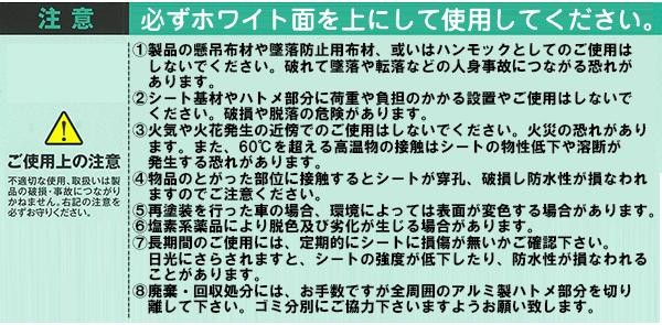 | 素材・材質 | シート本体:ポリエチレン ハトメ:アルミニウム(刻印有り) 周囲ロープ(補強用):ポリプロピレン |