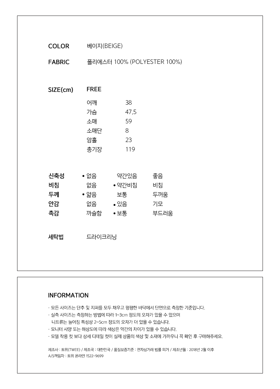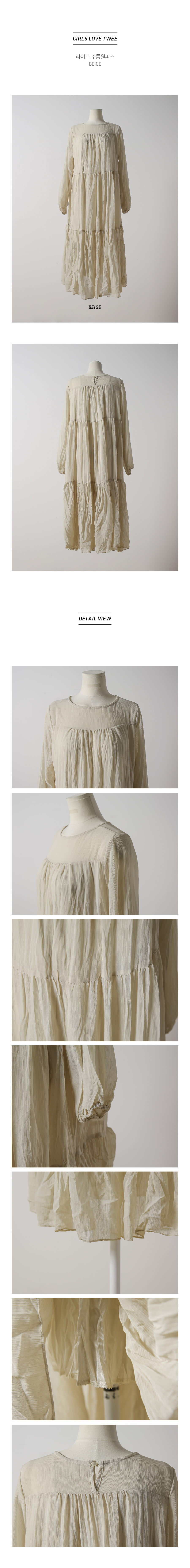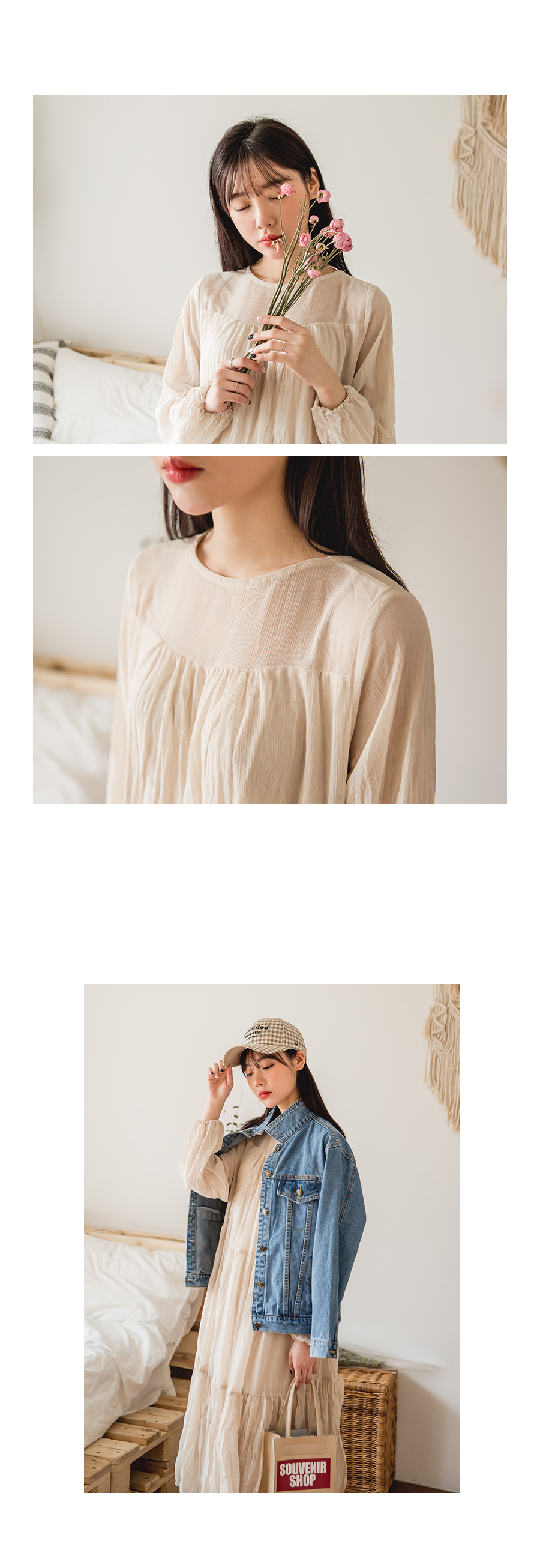 여성스러우면서도 소녀스러운 분위기를 느껴보실 수 있어요 ! FABRIC :하늘하늘한 소재로 지금부터 쭉~ 입기 좋답니다 부드러우면서도 살짝 드라이한 촉감으로 편안하게 연출하실 수 있어요 ~ :) DETAIL:숄더라인의 시스루로 되어있어 여리여리하게 연출해준답니다 ! 잔잔한 주름진 디테일과 롱한 기장감으로 페미닌하면서도 러블리함까지 더해주었답니다 ! 뒷버튼디테일로 간편하게