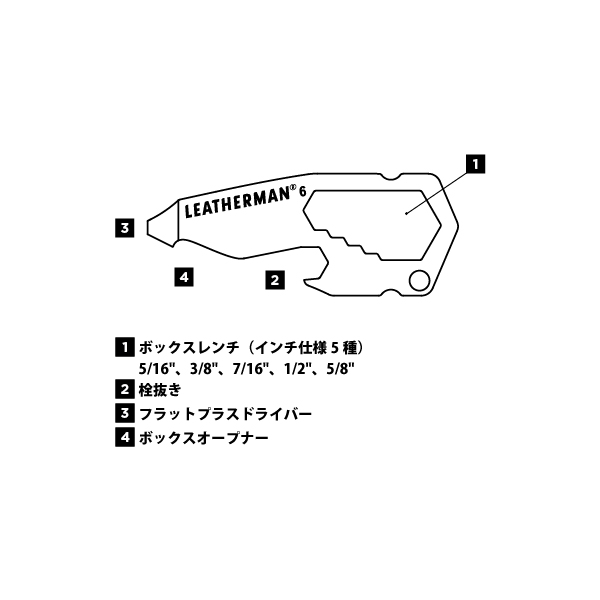●本体:ステンレススチール、キーリングホール、≪装備機能(4種)≫、①ボックスレンチ(インチ仕様5種)、(5/16"、3/8"、7/16"、1/2"、5/8")、②フラットプラスドライバー、③ボックスオープナー、④栓抜き、※10とはボックスレンチの仕様違い