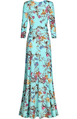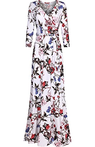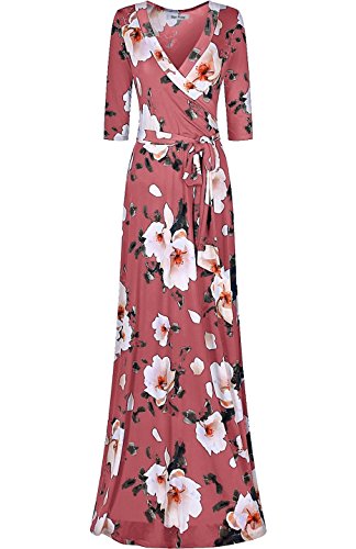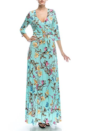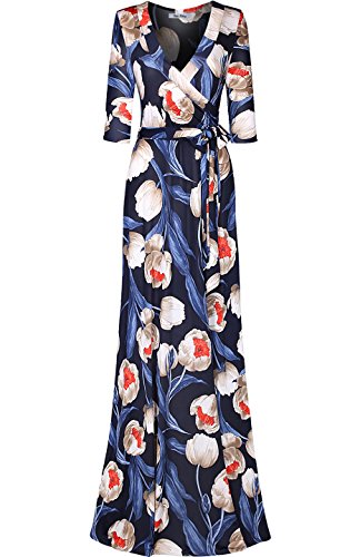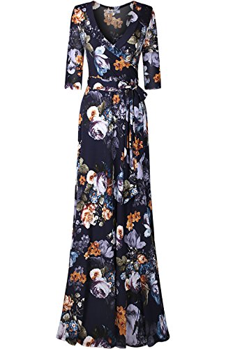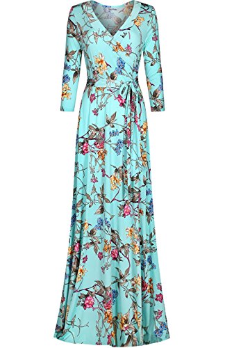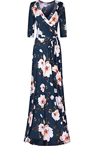 DESIGN: This floral printed floor length wrap dress features 3/4 sleeves, v-neck line, and ties around the waist creating a flattering silhouette for all body types.