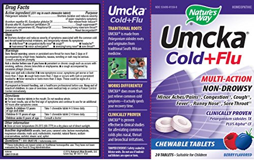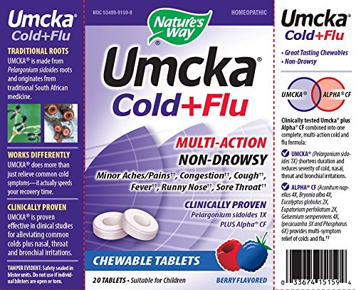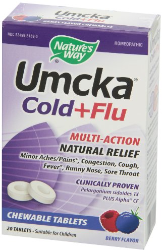 ReleaseDate : 2010-05-13 Studio : Nature's Way Publisher : Nature's Way Binding : Health and Beauty Product Description Nature's Way Umcka Cold and Flu Chewable, Berry is a tasty way to relief symptoms such as aches, congestion, cough, fever, runny nose and sore throat. 0