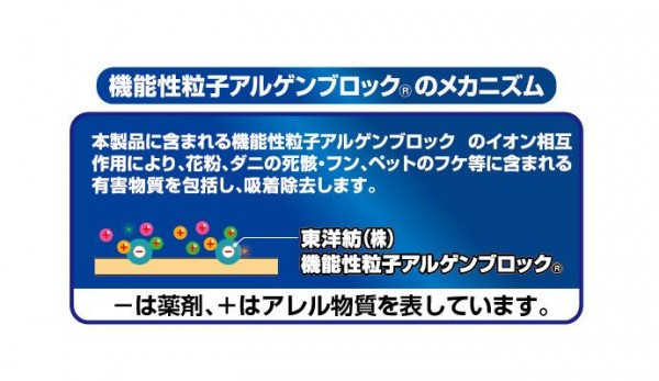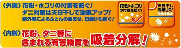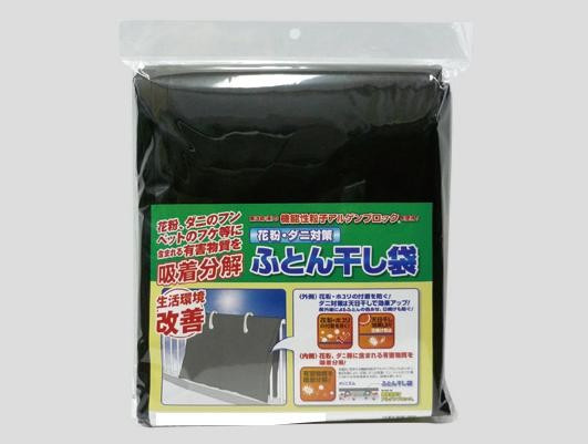 寝具は住空間において最もダニの発生が多い場所といわれており、それ故アレルゲンも非常に多くあります。当商品は、アレルゲンを吸着分解する抗アレルゲン干し袋です。天日干しにして死滅したダニやアレルゲンを、内側の抗アレルゲン処理により吸着分解します。 |