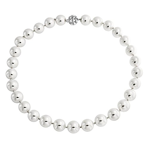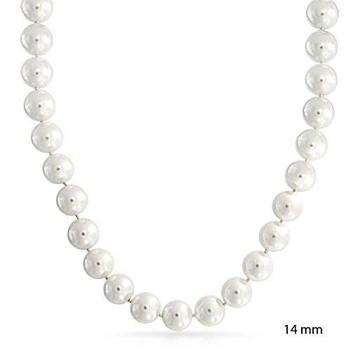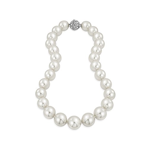 Accentuate your sophisticated side with these stunning 14mm Simulated Pearl necklaces. Simulated Pearl jewelry comes in many colors to help create an unforgettable ensemble. These bridal necklaces can be sensational for any occasion. The stunning 14mm Simulated Pearls float along this 16 or 18 inch strand perfectly strung with care and superior craftsmanship to meet the high demands of being the perfect bride. Give that special lady something to remember that will withstand the test of time. Share these Classic White Simulated Pearl necklaces this holiday season with the finicky jewelry lover in your life. The 16 or 18 inch White Simulated Pearl strand closes with a pave set Crystal ball clasp to ensure that every moment is picture perfect with the elegance of white Simulated Pearls.Feature