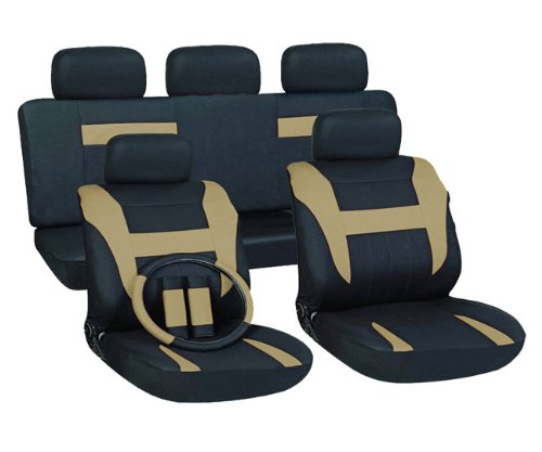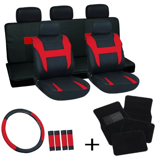 -. Feature : Seat cover set includes: 2 bucket seat covers, 1 back seat cover, 1 15inch universal steering wheel cover, 5 headrest covers, 5 seat belt pads, and mesh cloth / Rear bench accommodates left and right 40/60 & 50/50 split. / Includes two 26inch x 17inch Front Mats and two 13inch x 17inch Rear Mats / The floormats' water absorbant heel and anti-slip backing ensures they last for many years / Easy to install: no professional experience required