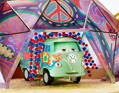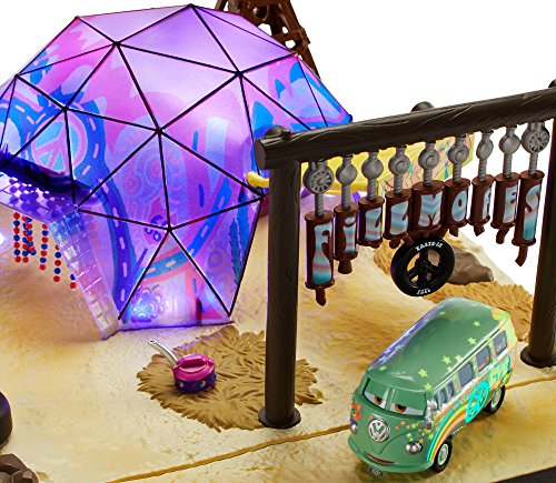 -. Feature : Based on a favorite setting in Disney/Pixar Cars / Fillmore's comes to spectacular life with lights, authentic decos, props and true to movie scale / A light sensor activates Day or Night modes / Iconic, retro details include beaded curtain, windmill and vintage Taste-in sign on Fillmore's house / When in dark mode, the dome lights up and Fillmore's van glows when parked inside