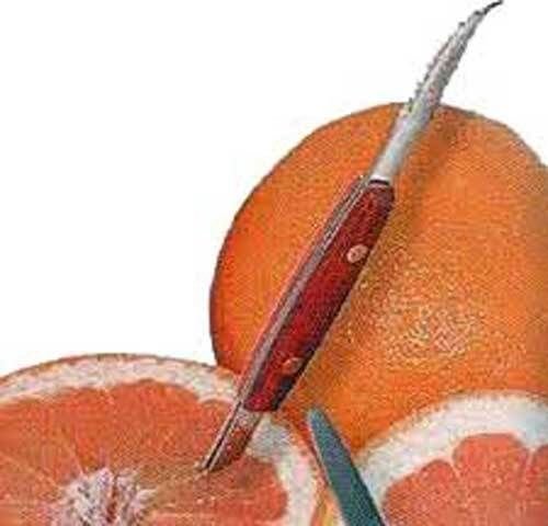 -. Feature : DESCRIPTION Grapefruit Knife Squirtless Double Blade - Kitchen Tools & Gadgets Curved blade on one end; serrated on each side. Designed for right or left hand use. Constructed with stainless steel blades; wooden handle. The twin blades on the opposite end separate the grapefruit neatly. Point won't pierce or puncture the membrane of your fruit. Perfect to free grapefruit, orange, lemons and other citrus fruits from their peel. The serrated edge cuts through stringy pith and tough flesh. The dull, rounded point won't pierce or puncture the membrane of your fruit and drain it's sought after juice. Use the Grapefruit Knife to free melon flesh from the rind, hull tomatoes and core onions. Measures: 8" long (All of my items are In Stock and Ready To Ship)