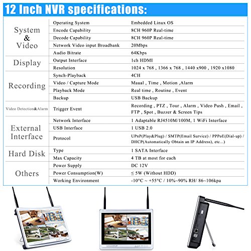 ★ Easy to use the 12inch monitor NVR kits: Plug and play, the only thing you need to do is connect the antennas with the cameras, then POWER the cameras amd NVR, all the cameras will auto pair with NVR, you will get the images on the 12inch monitor within minute.True Plug and Play. You don't have to do the other mess things. A sample video about how to install this system: https://youtu.be/EQxeK9grNOA
