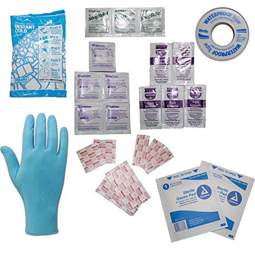 -. Feature : Be Prepared / With first aid essentials, athletes can get better fast and get back in the game. / Contents: (5) 3"x3" Gauze Pads, (1) Roll of Tape, (1) Pair Nitrile Gloves, / (10) Dynarex Strips X-Large, (5) Dynarex Strips Fingertip Bandages, (5) Strips Regular / (1) Mueller KOLD Instant Cold Pack, (5) 1/32 oz. Triple Antibiotic Ointment, (5) Antiseptic Wipes, (3) Sting Relief Towelettes