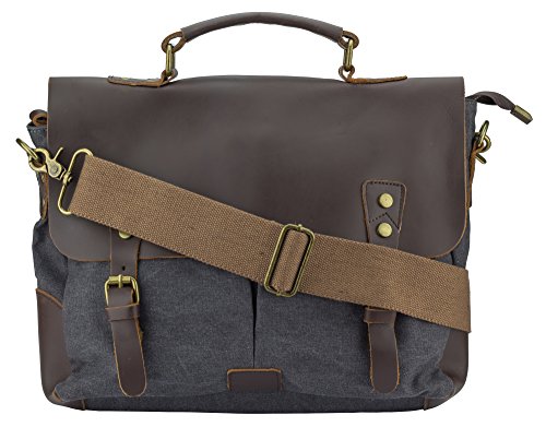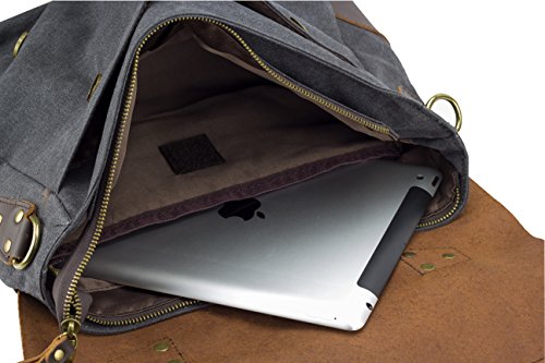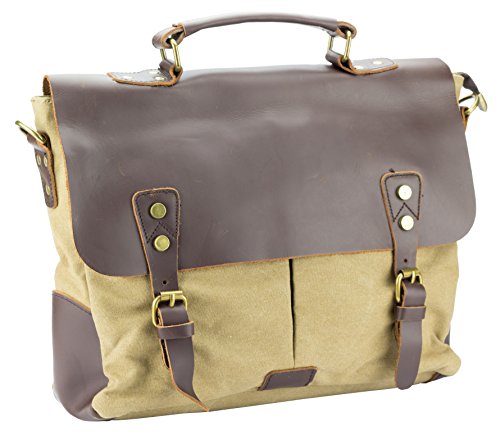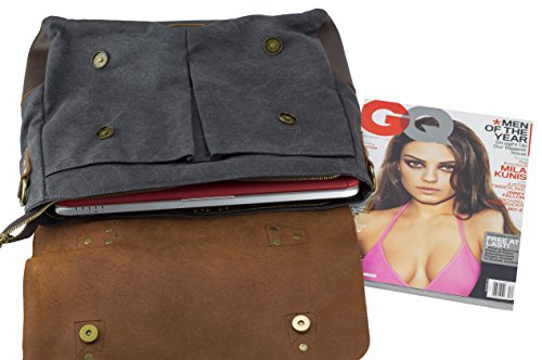- Large messenger bag made from heavy durable canvas, authentic leather with a large leather flap, zippered pocket and magnetic snaps to secure the contents