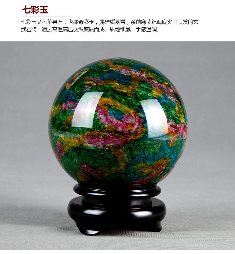 七彩玉又名苹果石,也称奇彩玉,属硅质基岩,系前寒武纪海底火山喷发的玄武岩浆,通过高温高压交织变质而成。质地细腻,手感温润。