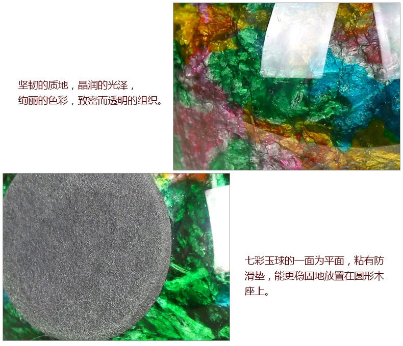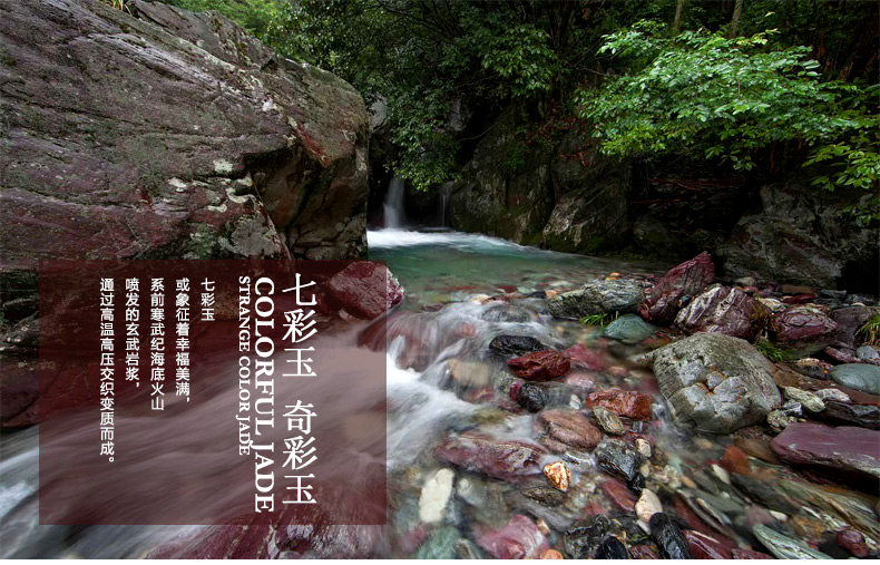 七彩玉的质坚、 色艳是难以复制的。虽称七彩玉,其实该石之色远不止七色,初步归纳起来可为:红如血、绿如翠,青如牛角、 白如银; 黑如墨、紫如霞,杂如彩练,黄如金。就七彩玉“红如血”而言,其实又分朱砂红、重枣红、鸡血红、玫瑰红、千层红等等,色泽明丽,赏之醒目怡神,触之细腻如肤。