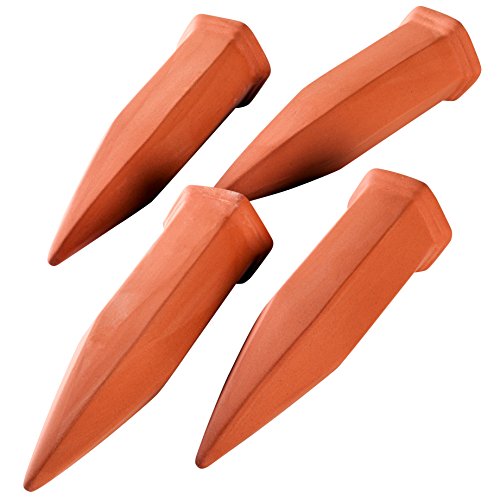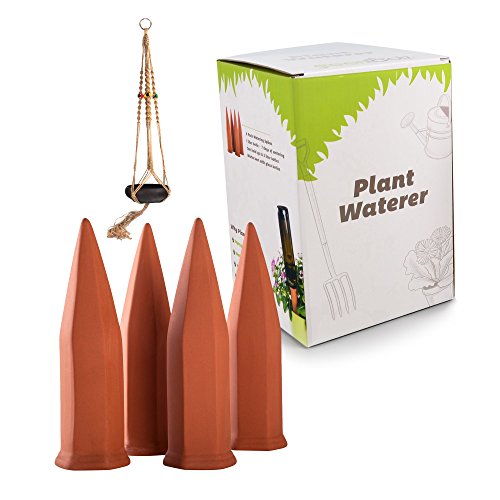 Terracotta Plant Watering Spikes 4 Pack Set, Self-Irrigation Watering Stakes for Flowers, Plants, Trees, Bushes, Shrubs and More - Plant Waterer - Garden Watering Spike, Includes Bonus Plant Hanger