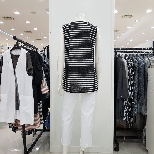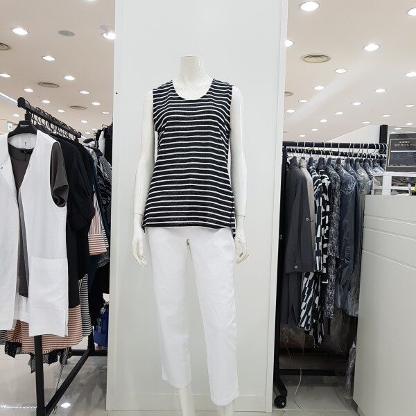 심플한 디자인이지만 데일리룩으로 입기 좋은 스트라이프 민소매 저지티셔츠 입니다 깔끔한 디자인으로 데님 팬츠 슬랙스와 코디하여 입기 좋습니다 루즈하지 않고 적당히 바디라인에 핏되는 슬림한 라인으로 편하게 입기 좋습니다