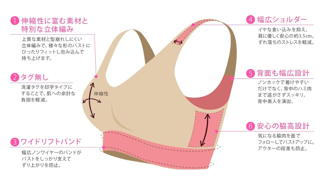 伸縮素材&立体編みで、どんなバストにも絶妙フィットします。幅広&脇高設計で、ハミ肉やアウターとの段差もスッキリ。