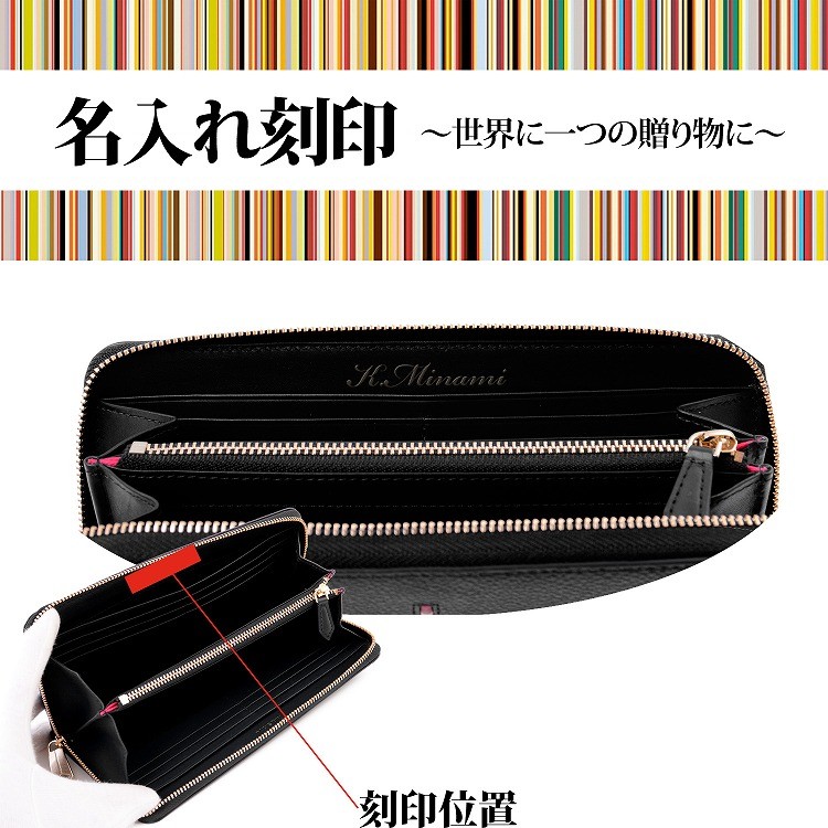センターにあしらわれた、クロスオーバーストライプをアクセントにしたラインが印象的な「インセットクロスオーバーストライプ」のラウンド長財布。 本体にはシュリンクの型押しを施したグレインレザーを使用。本革ならではのソフトな質感を残しながら、キズが目立ちにくく汚れもつきにくい耐久性も兼ね備えています。 センターのストライプ柄のラインは、本体部分をくり抜いて立体感のあるラインを表現したこだわりの仕上がりです。 |