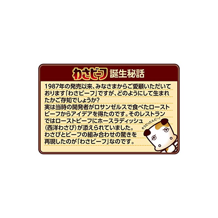 원재료:감자(유전자조 교환이 아니다)고, 식물성 기름지,granu당,단백 가수분해물,분말 간장,비프 파우더,식염,분말 소스,효모 엑기스 파우더,마늘,레드 페퍼,오니(귀신) 온,올리고당,포도당,덱스트린,고추냉이 파우더(나가노현 산고추냉이100%사용)고, 조미료(아미노산등)고, 향료,감미료(스테 비어,《스쿠라로스》)고, 카라멜 색소,신맛료,향신료 추출물,(원재료의 일부에 유성분,밀,닭고기,젤라틴을 포함한다)