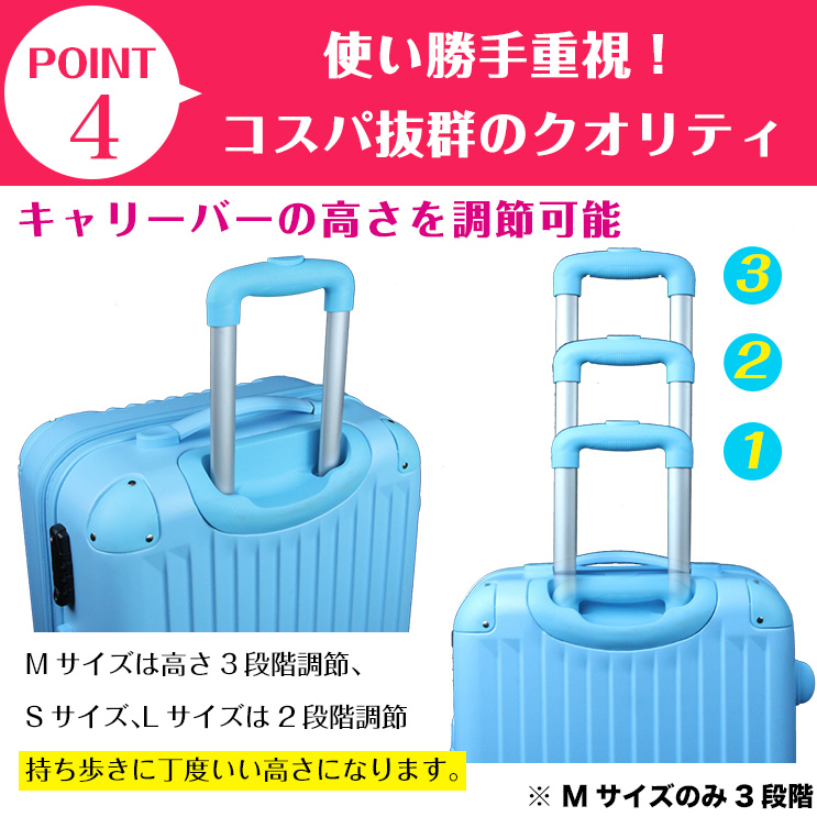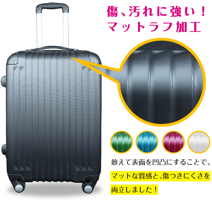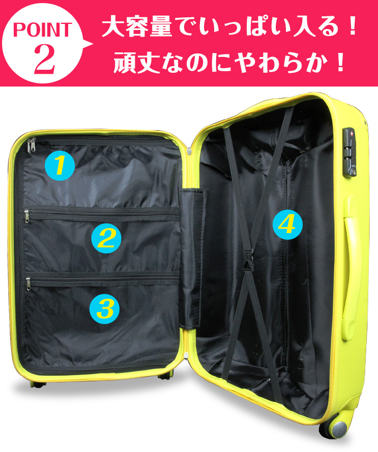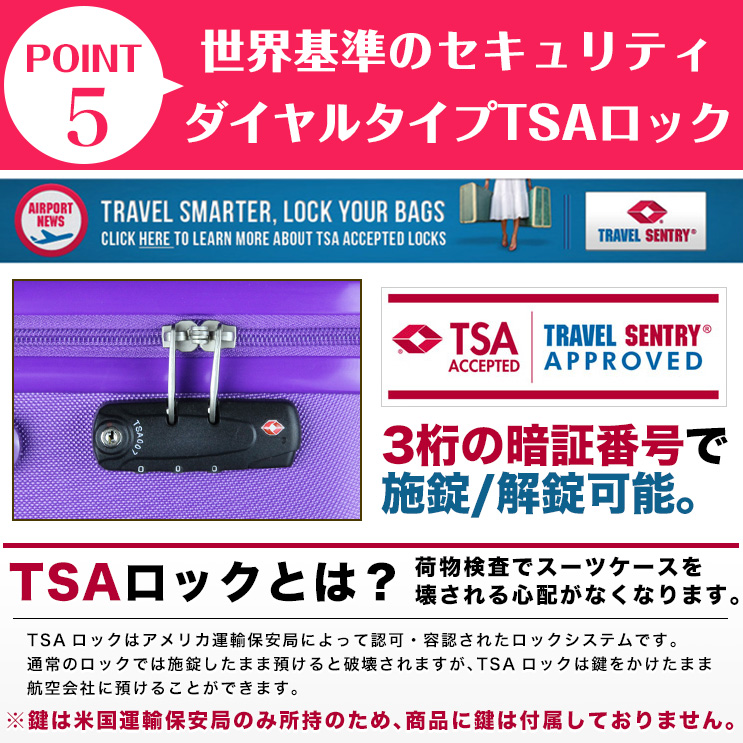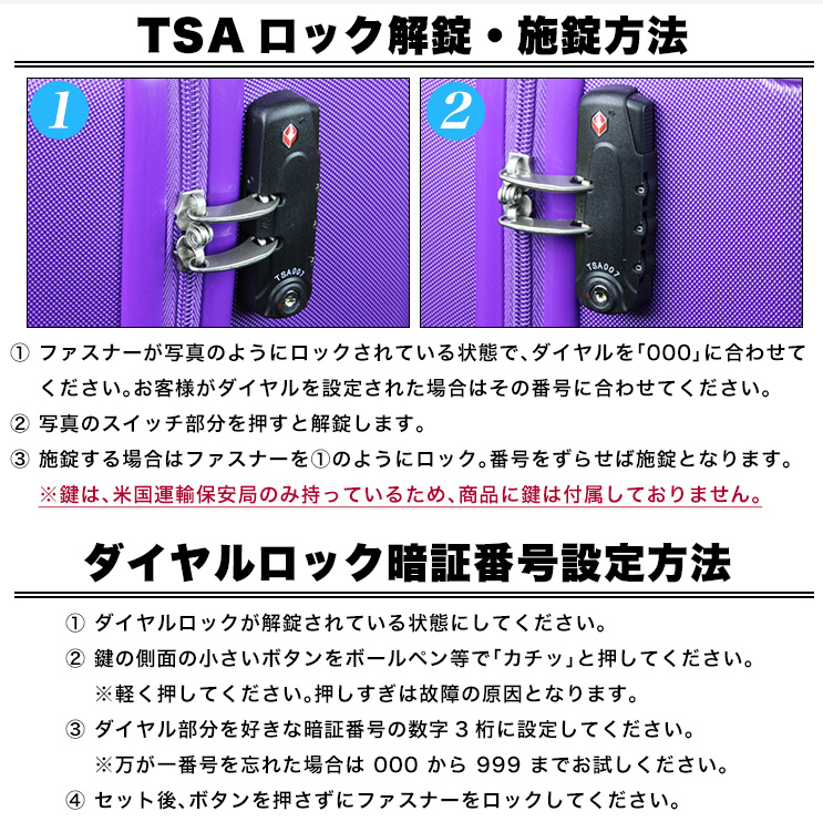 ※鍵はダイヤル式となり、初期設定は「000」で開錠出来ます。 ※鍵は空港の手荷物検査員が使用する特殊な鍵のため、当店・お客様を含めご使用できません。従って鍵の付属はありません。 ※パソコン・スマートフォン等ご覧いただく環境によって、実際の商品のお色・形が異なる場合がございます。
