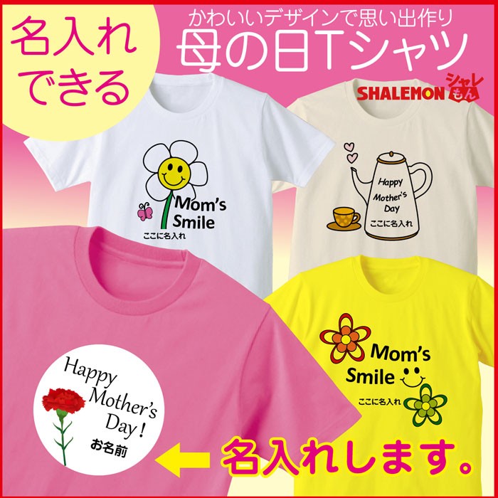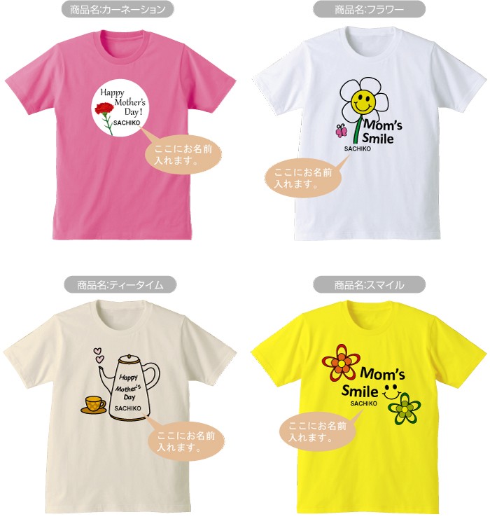 お母さんへの母の日プレゼントに!イラスト部分にお好きな5文字まで名入れできます!ご希望の名入れ文字はご注文ページを進んでいった備考欄に記入してください。Tシャツはレディース(女性用)TシャツS・M・Lからお選びいただけます。