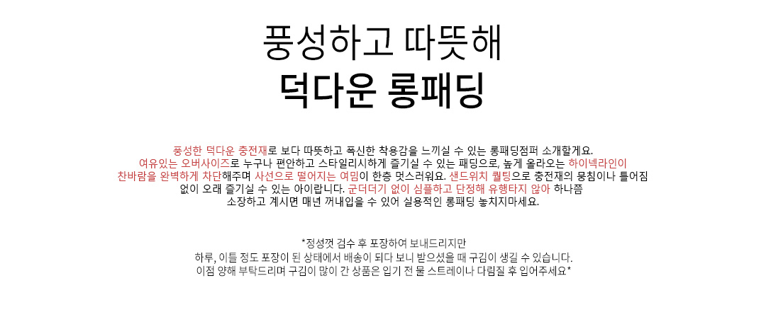 폴리에스테르(polyester/)100%/안감(lining)폴리에스테르(polyester/)100%/충전재(filling)오리솜털(duckdownyhair/)70%+오리깃털(duckfeather/)