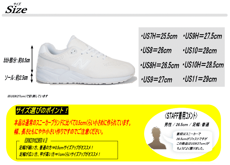 | サイズ | 作り⇒やや小さめ 【サイズ選びのポイント!】 足幅が細い方、普通の方⇒0.5cmくらいサイズアップがオススメ! 足幅が広い方、甲が高い方⇒1.0cmくらいサイズアップがオススメ! |