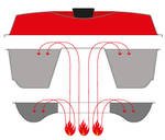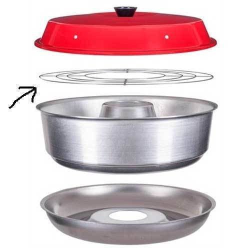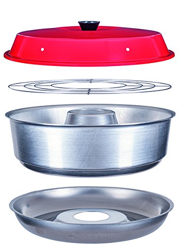Aluminum cooking & baking pot and lid -- steel base and stainless steel baking rack. Inside cooking dimensions: 9-1/4" diameter by 2-1/4" height. Unique heat distribution chimney cone is 3-3/4" diameter by 2-1/4" high.