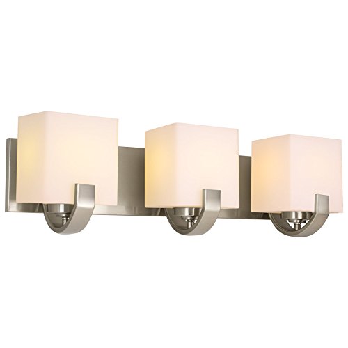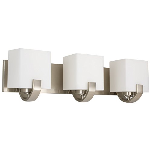 - Vanity boasts beautifully polished Brushed Nickel finish enhanced by smooth, clear-cut opal glass shades