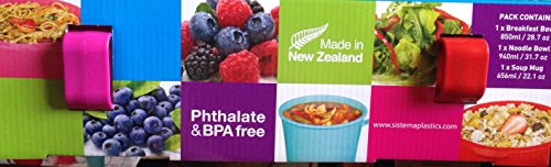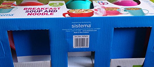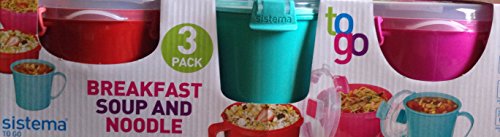 Value pack from Sistema combining 3 of the best selling items from the 'To Go' microwave range Pack contains Soup Mug, Oatmeal 'n' Porridge Breakfast Bowl and a Noodle Bowl Perfect for taking food to work for breakfast or lunchtime reheating Please note that pack colours vary and images shown are for illustration purposes only Your pack will contain 3 different colours from a mix of red, blue, purple, pink, orange, lime green and mint green Packs are selected at random and we are not able to offer a colour choice Soup mug - Capacity 656ml, Approximate measurements: Diameter 11cm, Height 10.5cm Oatmeal 'n' Porridge Breakfast Bowl - Capacity 850ml, Approximate measurements: Diameter 14cm, Height 9cm. Tip: Porridge becomes hotter more quickly in the plastic bowl and therefore doesn't need as long in the microwave as the porridge packs say Noodle Bowl - Ideal for reheating noodles, pasta, stews, etc. Capacity 940ml, Approximate measurements: Diameter 14cm, Height 10cm All measurements are excluding clips and handle Clips hold lids securely in place Pressure release vent in the centre of the lid for splatter free reheating Stay cool handles Made using food safe 100% lead free & BPA free materials Microwave, dishwasher and freezer safe This product will stain if used with high pigment foods such as tomato, carrot, beetroot, etc. This is normal for plastic products and does not affect the performance or safety of the product Mug and bowls should be carried in an upright position