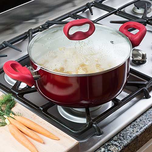 Tempered glass lid with steam vent and elevated lift handle. Ergonomic silicone handle is comfortable and stays cool.