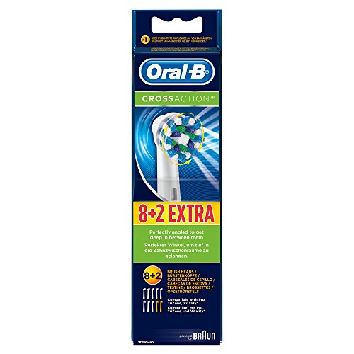 Oral-B CrossAction Replacement Heads are designed to reach deep in between teeth and cover more surface for a superior clean vs. a regular manual toothbrush. Features precisely angled bristles for a comprehensive clean. Various bristles levels can reach and remove more dental plaque than a regular manual toothbrush. Compatible with the entire line-up of Oral-B rechargeable handles, except for Oral-B sonic toothbrushes. Packaged Quantity: 10 (specifications are for single item)Feature