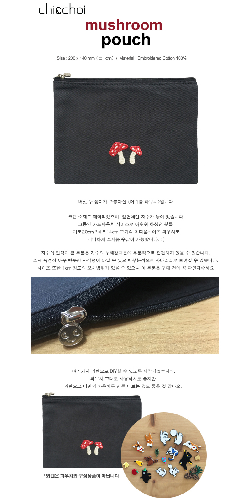 파우치 그대로 사용해도 좋지만, 버섯에 나만의 와펜을 부착해서 사용해도 즐거울 것 같아요!