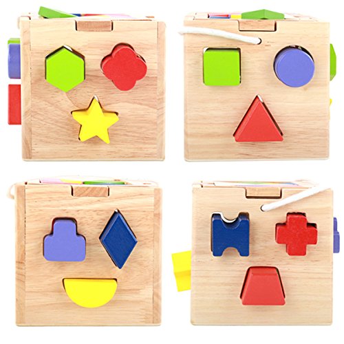 Fun shape sorter This classic wooden shape sorter is so fun! The beautifully crafted toy features smooth, natural wood, and 12 cut-out shapes in four of the sides.