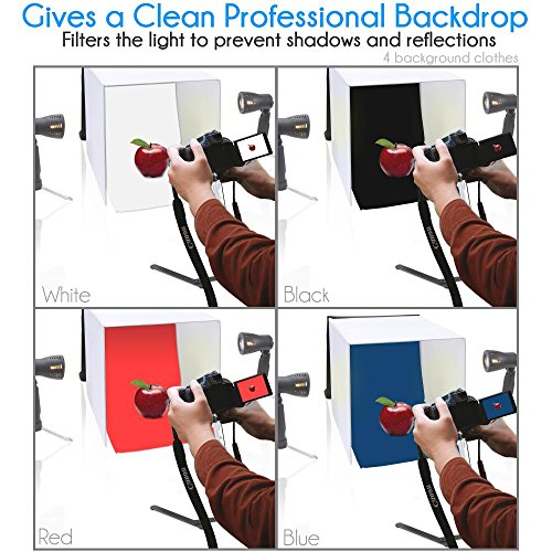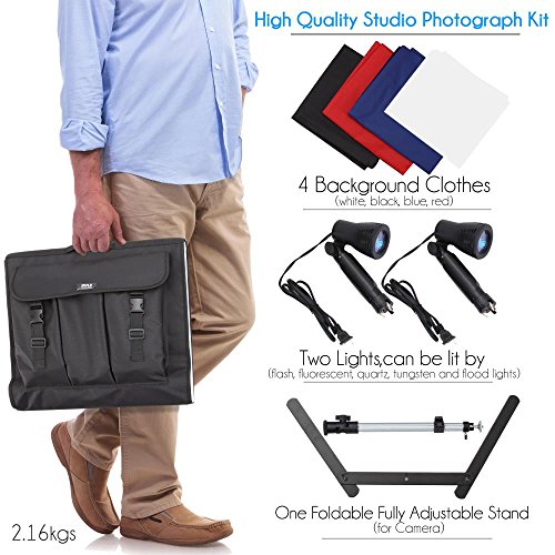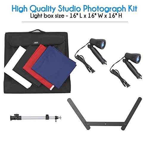 The Studio Photo Light Booth, Image Photography Kit by Pyle is Specially designed for photography enthusiasts, artists and even beginners to be able to take professional looking shots. This product includes all the items that you will need to make your photos stand out. Features: High-quality studio photography kit, booth, tent,16’’x16’’x16’’ inches Filters the light to prevent shadows and reflections Comes with 4 background clothes, white, black, blue, red Gives a clean professional backdrop to all items being photographed Comes one foldable fully adjustable stand for camera, Comes with two lights, can be lit by flash, fluorescent, quartz, tungsten and flood lights The cube can be packed like a bag and there are 3 pockets for lights and stand, Light box size - 16" L x 16" W x 16" H Product weight:4.76 lbs. Product size: 15.7’’x15.7’’x15.7’’ inches Inner box size:17.7’’ x 3.5’’ x 17.7’’ inches 0 |