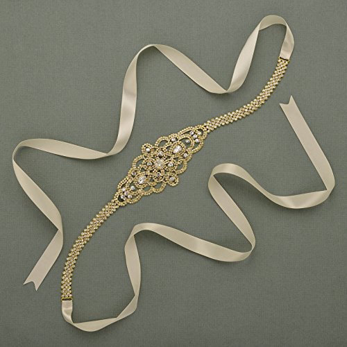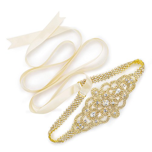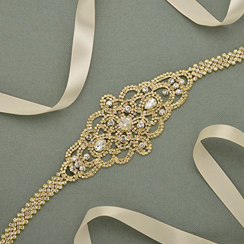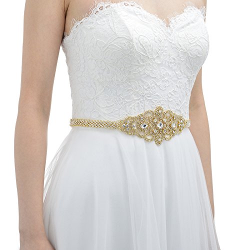 SWEETV Sparkly Rhinestone Belt Bridal Sash Applique Crystal Embellishments for Dresses, Gold
