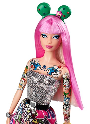 Doll wears a silvery sequined top with iconic print skirt and whimsical accessories