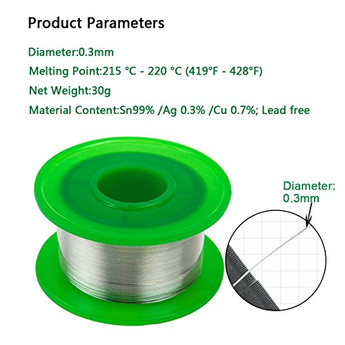 Size and ingredient: the diameter of the electrical soldering wire is 0.3 mm/ 0.01 inch; Sn/ Ag/ Cu: 99%/ 0.3%/ 0.7%; Flux: 2%
