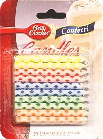 Product DescriptionBetty Crocker® Confetti Candles Birthday Sandles. See back panel for safety information.0