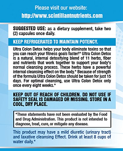 -. Binding : Health and Beauty -. Brand : Scintillant Nutrients -. EAN : 0646437160926 -. Feature : WEIGHT LOSS: Jumpstart your weight loss program with a colon cleanse. By cleansing your colon you will help your digestive system to breakdown food, absorb nutrients and eliminate waste. You will get more from all those healthy foods. / DETOX: Put a spring in your step, sparkle in your eye and be filled with energy. Get rid of that build up of nasty toxins in your gut. With a healthy digestive system you can gain increased energy levels and immunity. / CONSTIPATION RELIEF: It's not fun to be constipated. If you are not going daily then you need the need the gentle laxative effects to cleanse your colon. Don't take your colon for granted. It works automatically when your colon is healthy, but when its not life can be miserable. / ALL NATURAL: Combining 11 healthy herbs, fibers and nutrients, you won't find a more natural way to cleanse your body. Feel at your best now. Love yourself and your tummy. / MADE IN USA TO GUARANTEE QUALITY: Made in FDA registered facility. There is a 60 day manufacturers guarantee so why not try today. -. IsAdultProduct : 0 -. Label : Scintillant Nutrients -. Manufacturer : Scintillant Nutrients -. PackageQuantity : 1 -. ProductGroup : Health and Beauty -. ProductTypeName : HEALTH_PERSONAL_CARE -. Publisher : Scintillant Nutrients -. Studio : Scintillant Nutrients -. Title : ULTRA COLON DETOX Natural Herbal Best Colon Health and Care Super Cleanse Cleanser Clenz or Cleansing for Weight Loss and Detox Constipation Relief Remedies when Constipated -. UPC : 646437160926