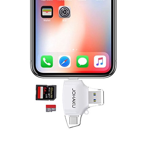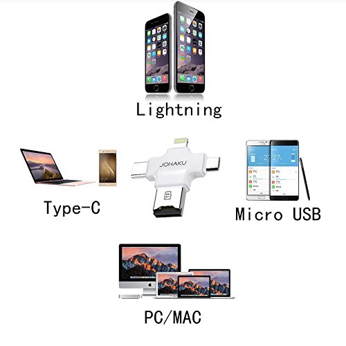 【JOHAKU FOUR IN ONE MICRO SD CARD READER】 - This Card Reader is great compatibility for all your devices. It has four interfaces: lighting connector for iOS devices; Micro USB connector for Android devices (with OTG); USB connecto for computers/Macs; Type-C connector is for Type-C devices.